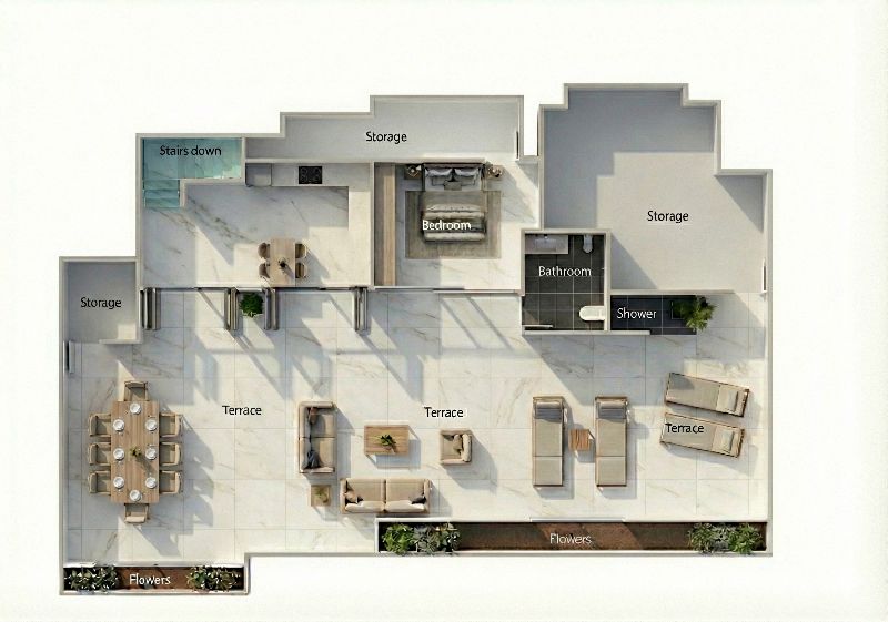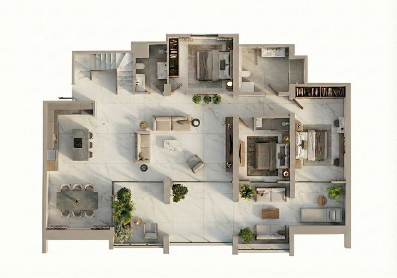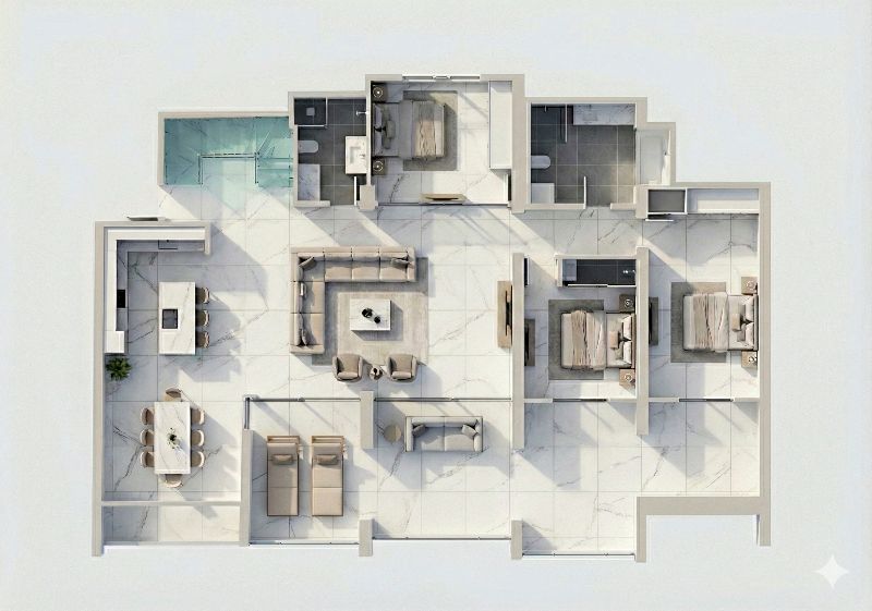 The Main Residence (First Floor) Step into a bright, modern sanctuary featuring a sleek, fully equipped kitchen that opens into an expansive living room. The living area is designed with flexibility in mind—spacious enough to easily partition a section for an additional bedroom or home office without sacrificing comfort. This level also includes two generous bedrooms, two pristine bathrooms, and direct access to a large private balcony perfect for morning coffee.